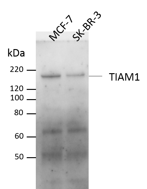 Total cell lysates from MCF-7 and SK-BR-3 were subjected to western blot. PVDF membrane were probed with 1 um/ml Human TIAM1 Antibody (AF5038). A specific band was detected for TIAM1 at approximately 180 kDa. This experiment was conducted under reducing conditions.