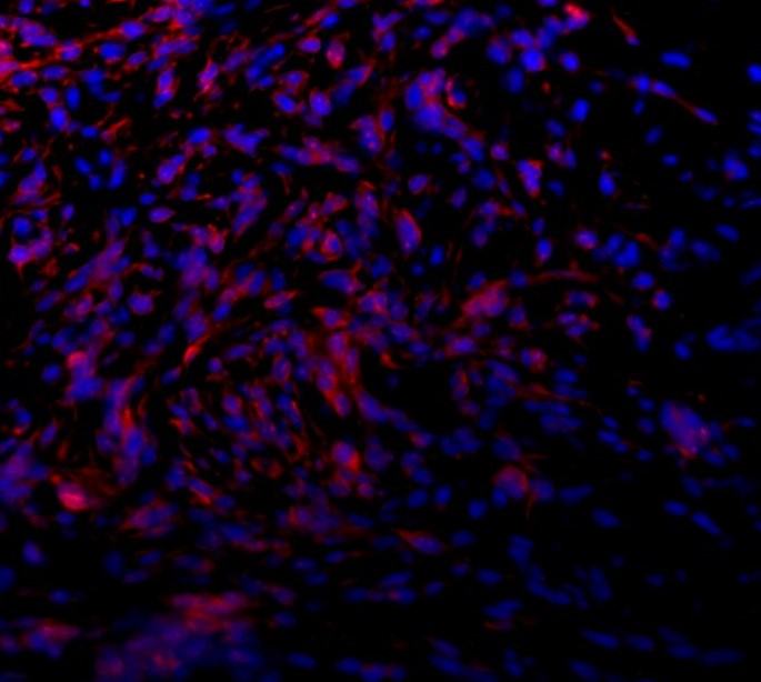 MRP1 in Human PBMCs. MRP1 was detected in immersion fixed Human peripheral blood mononuclear cells using Mouse Anti-Human MRP1 Monoclonal Antibody (Catalog # MAB19291) at 25 µg/mL for 3 hours at room temperature. Cells were stained using the NorthernLights™ 557-conjugated Anti-Mouse IgG Secondary Antibody (red; NL007) and counterstained with DAPI (blue). Specific staining was localized to cytoplasm. Staining was performed using our protocol for Fluorescent ICC Staining of Non-adherent Cells.