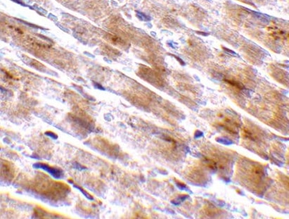 Myoglobin in Human Heart. Myoglobin was detected in immersion fixed paraffin-embedded sections of human heart using Rabbit Anti-Human Myoglobin Monoclonal Antibody (Catalog # MAB97204) at 3 µg/mL for 1 hour at room temperature followed by incubation with the Anti-Goat IgG VisUCyte™ HRP Polymer Antibody (Catalog # VC004). Tissue was stained using DAB (brown) and counterstained with hematoxylin (blue). Specific staining was localized to cardiomyocytes. View our protocol for IHC Staining with VisUCyte HRP Polymer Detection Reagents.