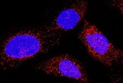 Neurogranin in SW480 Human Cell Line. Neurogranin was detected in immersion fixed SW480 human liposarcoma cell line (positive staining) and MOLT‑4 human acute lymphoblastic leukemia cell line using Mouse Anti-Human Neurogranin Monoclonal Antibody (Catalog # MAB79471) at 8 µg/mL for 3 hours at room temperature. Cells were stained using the NorthernLights™ 557-conjugated Anti-Mouse IgG Secondary Antibody (red; NL007) and counterstained with DAPI (blue). Specific staining was localized to cytoplasm. Staining is performed using our protocol for Fluorescent ICC Staining of Non-adherent Cells.