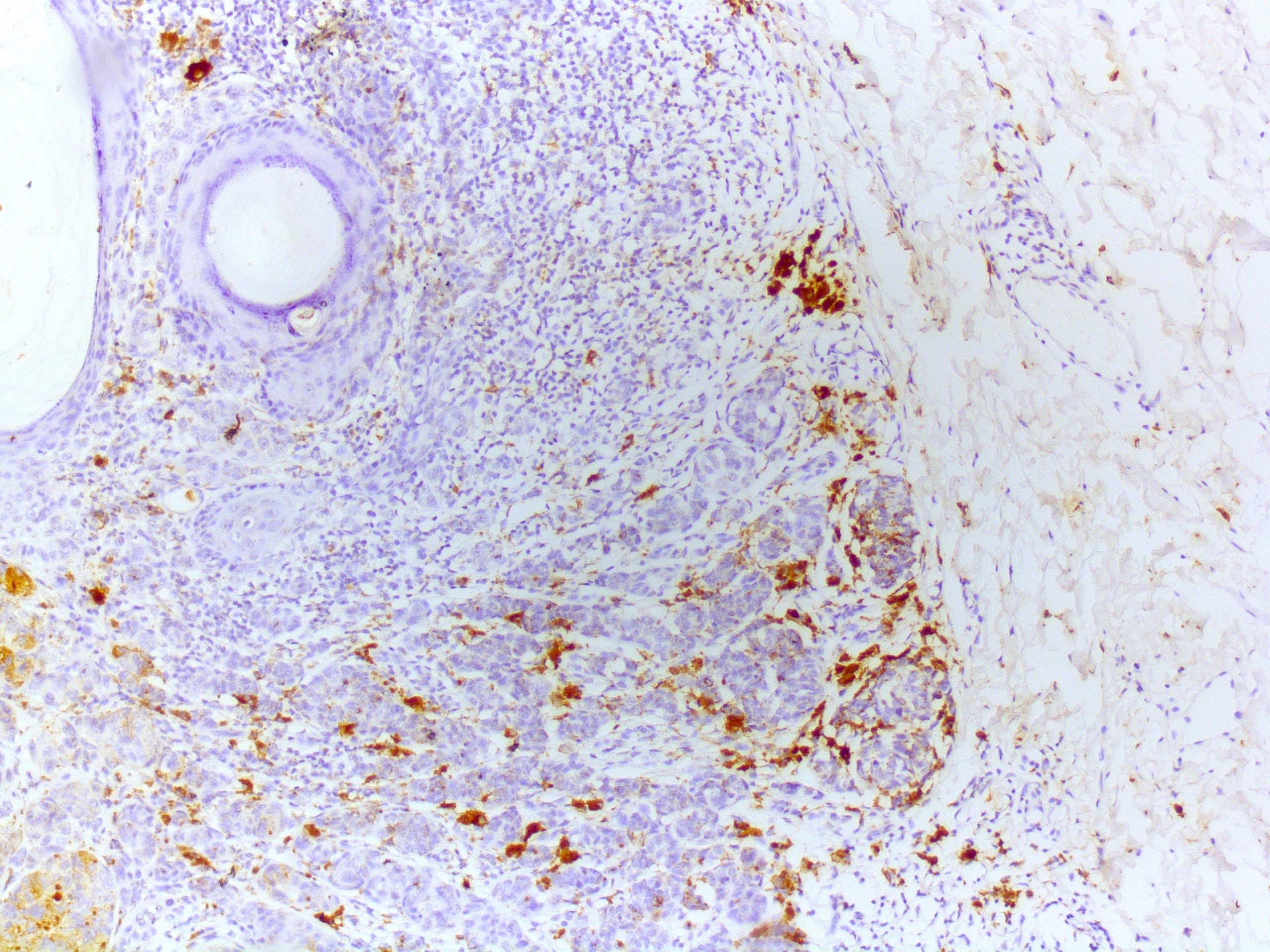 Seems like the immune cells show a little staining. At 1:250 all cells showed staining. Dilutions are important.