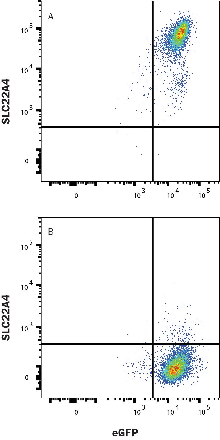 HEK293 human embryonic kidney cell line transfected with (A) human OCTN1/SLC22A4 or (B) irrelevant protein, and eGFP was stained with Mouse Anti-Human OCTN1/SLC22A4 Monoclonal Antibody (Catalog # MAB10985) followed by Allophycocyanin-conjugated Anti-Mouse IgG Secondary Antibody (F0101B). Quadrant markers were set based on Mouse IgG2A Isotype Control (MAB003, data not shown). Staining was performed using our Staining Membrane-associated Proteins protocol.