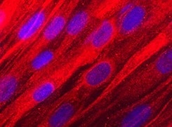 Osteoadherin/OSAD in Human Mesenchymal Stem Cells. Osteoadherin/OSAD was detected in immersion fixed human mesenchymal stem cells differentiated into osteocytes using Mouse Anti-Human Osteoadherin/OSAD Monoclonal Antibody (Catalog # MAB2884) at 10 µg/mL for 3 hours at room temperature. Cells were stained using the NorthernLights™ 557-conjugated Anti-Mouse IgG Secondary Antibody (red; Catalog # NL007) and counterstained with DAPI (blue). Specific staining was localized to cytoplasm. View our protocol for Fluorescent ICC Staining of Stem Cells on Coverslips.