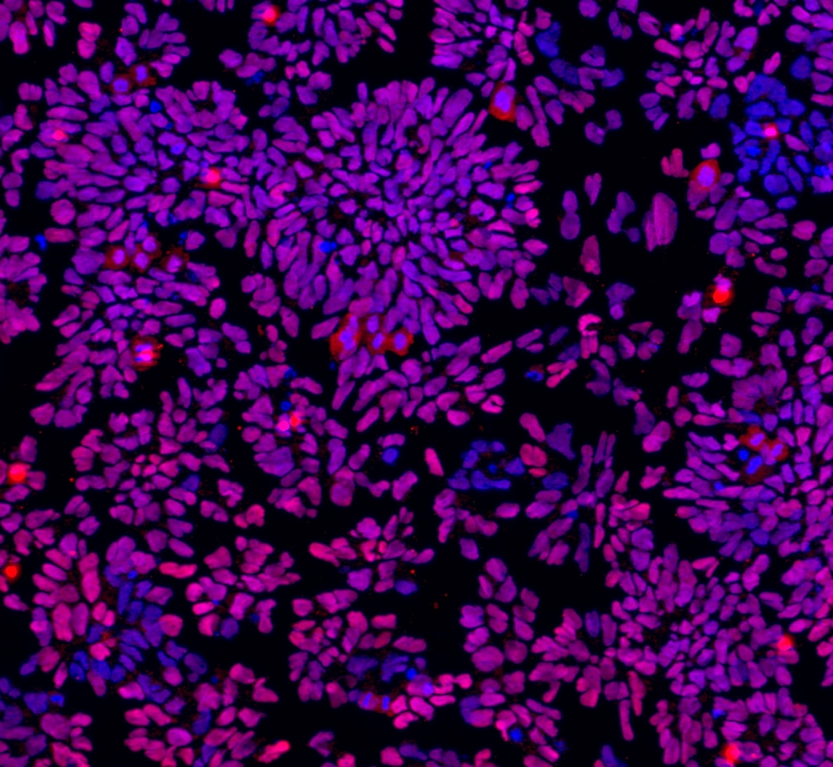 Otx2 in NTera‑2 Human Cell Line. Otx2 was detected in immersion fixed NTera-2 human testicular embryonic carcinoma cell line using Goat Anti-Human Otx2 Antigen Affinity-purified Polyclonal Antibody (Catalog # AF1979) at 10 µg/mL for 3 hours at room temperature. Cells were stained using the NorthernLights™ 557-conjugated Anti-Goat IgG Secondary Antibody (yellow, upper panel; Catalog # NL001) and counterstained with DAPI (blue, lower panel). View our protocol for Fluorescent ICC Staining of Cells on Coverslips.