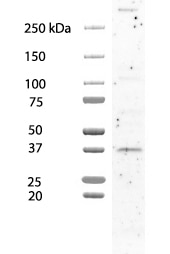Detection of Human Otx2 by Western Blot. Western blot shows lysates of IMR-32 human neuroblastoma cell line. PVDF membrane was probed with 1 µg/mL of Goat Anti-Human Otx2 Antigen Affinity-purified Polyclonal Antibody (Catalog # AF1979) followed by HRP-conjugated Anti-Goat IgG Secondary Antibody (Catalog # HAF017). A specific band was detected for Otx2 at approximately 37 kDa (as indicated). This experiment was conducted under reducing conditions and using Immunoblot Buffer Group 1.