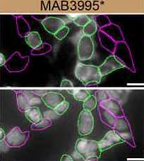 Park7/DJ‑1 Specificity is Shown by Immunocytochemistry in Knockout Cell Line. HEK293T human embryonic kidney parental cell line WT and Park7/DJ‑1 HEK293T KO cells were labelled with a green or a far-red fluorescent dye, respectively. Cells were stained with Rat Anti-Human Park7/DJ‑1 Monoclonal Antibody (Catalog # MAB3995) followed by incubation with an Alexa-fluor 555 conjugated secondary antibody (upper panel). DAPI-only counterstained cells shown on a lower panel. Acquisition of the blue (nucleus-DAPI), green (identification of WT cells), red (antibody staining) and far-red (identification of KO cells) channels was performed. Representative images of the blue and red (grayscale) channels are shown. WT and KO cells are outlined with green and magenta dashed line, respectively. Primary antibody dilution used: 1µg/mL. Image, protocol and testing courtesy of YCharOS Inc. (ycharos.com).
