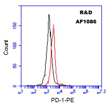10^6 Human PBMCs were probed with 0.5 ug of Goat anti-Human PD-1 antibody (red), or Goat Isotype Control IgG (black), followed by PE-conjugated anti-Goat secondary antibody.