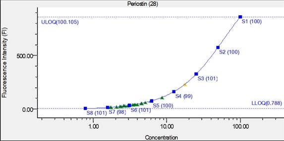 We coupled the magnetic beads with capture antibody and developed a customized human Periostin/OSF-2 Luminex assay, which was applied to a panel of patient serum samples. The kits worked well in both standard and human serum samples.