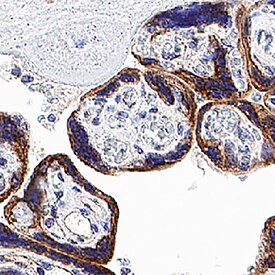 PlGF-4 was detected in immersion fixed paraffin-embedded sections of human placenta using Mouse Anti-Human PlGF-4 Monoclonal Antibody (Catalog # MAB26441) at 5 µg/mL for 1 hour at room temperature followed by incubation with the Anti-Mouse IgG VisUCyte™ HRP Polymer Antibody (VC001). Before incubation with the primary antibody, tissue was subjected to heat-induced epitope retrieval using Antigen Retrieval Reagent-Basic (CTS013). Tissue was stained using DAB (brown) and counterstained with hematoxylin (blue). Specific staining was localized to Syncytiotrophoblast. Staining was performed using our protocol for IHC Staining with VisUCyte HRP Polymer Detection Reagents.