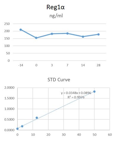 We used this antibody in an in-house ELISA along with mAb (49371) and protein standard to quantify Reg1 alpha in human serum and plasma. This combination detected Reg1alpha in human serum and plasma.