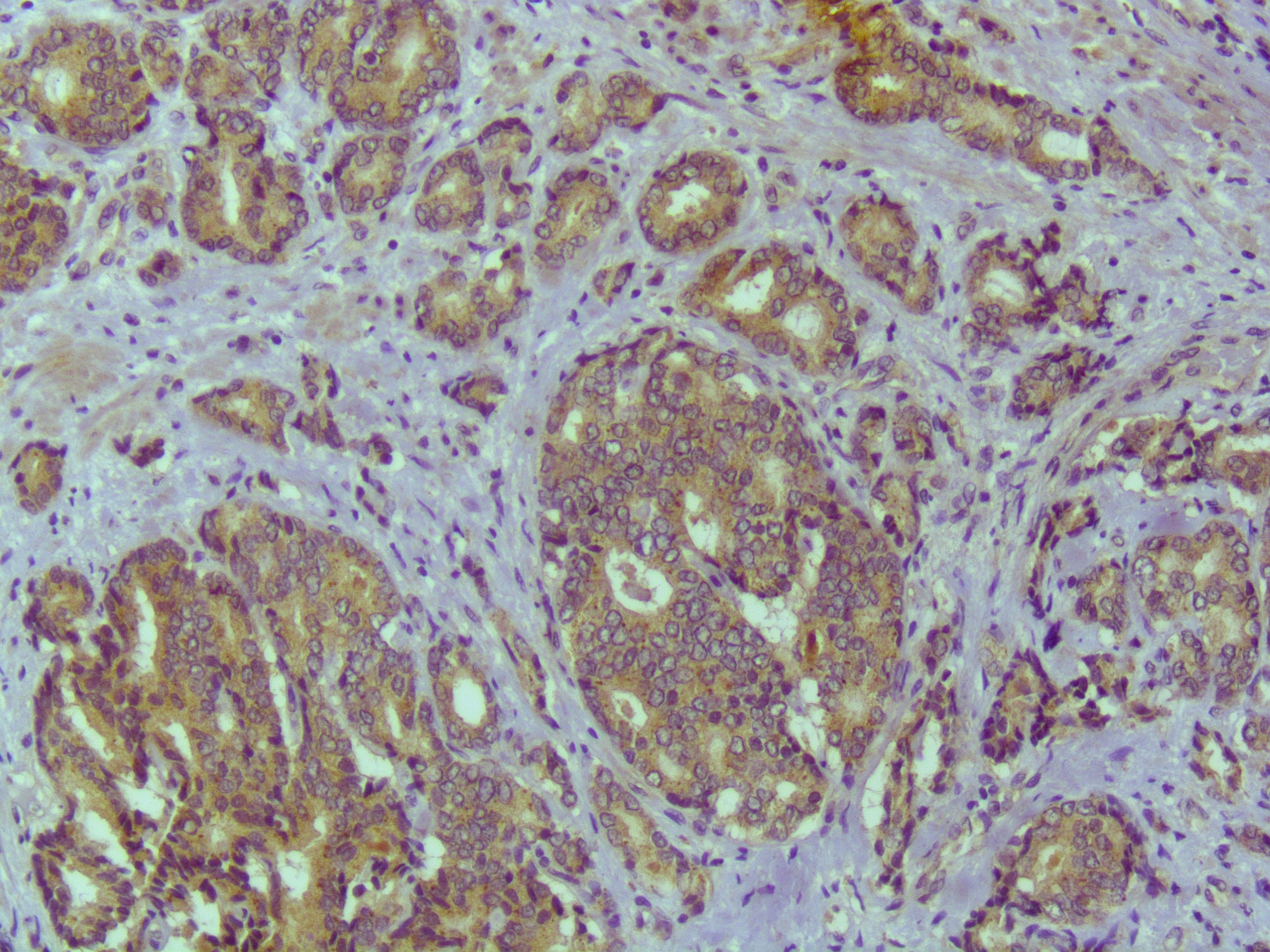 SHBG in Human Hepatocellular Carcinoma Tissue. SHBG was detected in immersion fixed paraffin-embedded sections of human hepatocellular carcinoma tissue using Mouse Anti-Human SHBG Monoclonal Antibody (Catalog # MAB26563) at 5 µg/mL for 1 hour at room temperature followed by incubation with the Anti-Mouse IgG VisUCyte™ HRP Polymer Antibody (Catalog # VC001). Before incubation with the primary antibody, tissue was subjected to heat-induced epitope retrieval using Antigen Retrieval Reagent-Basic (Catalog # CTS013). Tissue was stained using DAB (brown) and counterstained with hematoxylin (blue). Specific staining was localized to cytoplasm in cancer cells. View our protocol for IHC Staining with VisUCyte HRP Polymer Detection Reagents.