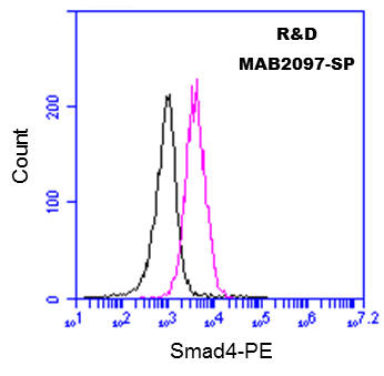 Detection of Smad4 in HeLa Human Cell Line by Flow Cytometry. HeLa human cell line was stained with Mouse Anti-Human Smad4 Monoclonal Antibody (Catalog # MAB2097, filled histogram) or isotype control antibody (Catalog # MAB0041, open histogram), followed by Allophycocyanin-conjugated Anti-Mouse IgG F(ab')2Secondary Antibody (Catalog # F0101B). To facilitate intracellular staining, cells were fixed with paraformaldehyde and permeabilized with saponin.