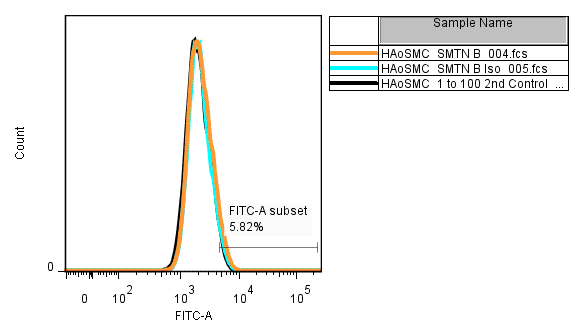 Detection of Smoothelin in HASMC Human Cells by Flow Cytometry. HASMC human aortic smooth muscle cells was stained with Mouse Anti-Human Smoothelin B Monoclonal Antibody (Catalog # MAB8278, filled histogram) or isotype control antibody (Catalog # MAB002, open histogram), followed by Phycoerythrin-conjugated Anti-Mouse IgG Secondary Antibody (Catalog # F0102B). View our protocol for Staining Intracellular Molecules.