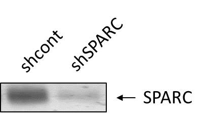Detection of Human SPARC by Western Blot Verification of knockdown of SPARC expression by lentivirus-mediated RNA interference. (A) GFP expression images showed shRNA delivery efficiency. (Magnification × 200). (B) SPARC protein expressions of SPARC shRNA infected cells, control shRNA infected cells and non-infected cells as measured by Western blot. (C) SPARC mRNA expressions of SPARC shRNA infected cells, control shRNA infected cells and non-infected cells as measured by q-RT-PCR. (D) SPARC protein expressions of SPARC shRNA infected cells, control shRNA infected cells and non-infected cells as measured by ICC staining (Magnification ×200). *P<0.05 versus control. Image collected and cropped by CiteAb from the following open publication (https://bmccancer.biomedcentral.com/articles/10.1186/1471-2407-12-464), licensed under a CC-BY license. Not internally tested by R&D Systems.