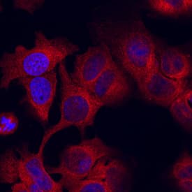 ST6GALNAC4 in MCF‑7 Human Cell Line. ST6GALNAC4 was detected in immersion fixed MCF-7 human breast cancer cell line using Sheep Anti-Human ST6GALNAC4 Antigen Affinity-purified Polyclonal Antibody (Catalog # AF6876) at 10 µg/mL for 3 hours at room temperature. Cells were stained using the NorthernLights™ 557-conjugated Anti-Sheep IgG Secondary Antibody (red; Catalog # NL010) and counterstained with DAPI (blue). View our protocol for Fluorescent ICC Staining of Cells on Coverslips.
