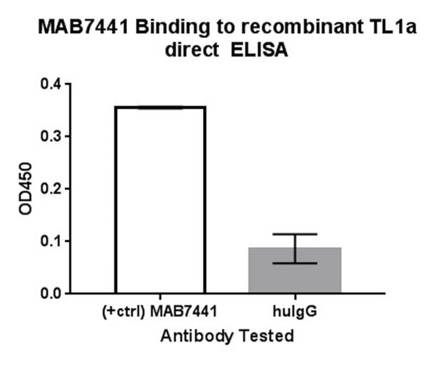 Use for detection of TL1A in a sandwich ELISA (2.5ug/mL concentration), and for detection of recombinant TL1A in Western blots at a 1:1000 dilution, followed by a Licor secondary antibody.