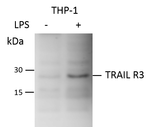 THP-1 cells were treated with LPS (100 mg/ml) for 24h. Total cell lysates were subjected to western blot. PVDF membrane were probed with 1mm/ml Human TRAIL R3 Antibody (MAB6302). A specific band was detected for TRAIL R3 at approximately 28 kDa. This experiment was conducted under reducing conditions.