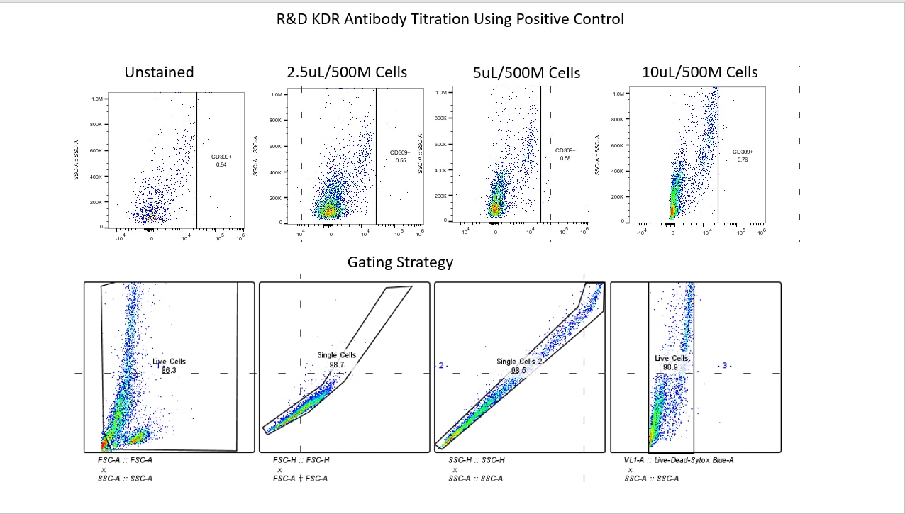 Detection of Human VEGFR2/KDR/Flk-1 by Flow Cytometry Flow cytometry-derived EPC definitions.(A) Cells isolated from whole blood by density gradient separation were gated by forward and side scatter to select mononuclear cells by excluding erythrocytes, granulocytes and cell debris. (B) The mononuclear-gated cells that stained positive for CD34-FITC were analyzed for the presence or absence of CD45-PC5. (C) Mononuclear cells were also analyzed for co-staining of CD34-FITC and KDR-PE. MNC, mononuclear cell; CD34-FITC, fluorescein isothiocyanate-conjugated CD34; CD45-PC5, phycoerythrin-Cy5-conjugated CD45; KDR-PE, phycoerythrin-conjugated KDR. Image collected and cropped by CiteAb from the following publication (https://pubmed.ncbi.nlm.nih.gov/24736282), licensed under a CC-BY license. Not internally tested by R&D Systems.
