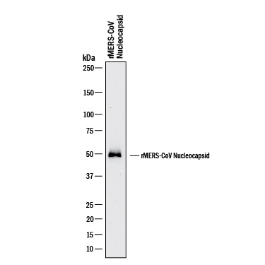Western blot shows recombinant MERS-CoV Nucleocapsid protein. PVDF membrane was probed with 1 µg/mL of Mouse Anti-Mouse MERS-CoV Nucleocapsid Monoclonal Antibody (Catalog # MAB10729) followed by HRP-conjugated Anti-Mouse IgG Secondary Antibody (HAF018). A specific band was detected for MERS-CoV Nucleocapsid at approximately 49 kDa (as indicated). This experiment was conducted under reducing conditions and using Western Blot Buffer Group 1.