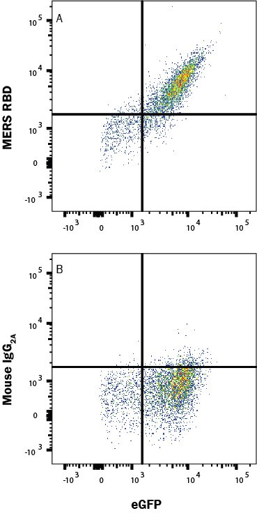 HEK293 human embryonic kidney cell line transfected with human CD26 and eGFP was incubated with Recombinant MERS-CoV Spike S1 Fc protein (10606-CV), then stained with (A) Mouse Anti-MERS-CoV-2 Spike Monoclonal Antibody (Catalog # MAB107073) or (B) Mouse IgG2A Isotype Control Antibody (MAB003) followed by Allophycocyanin-conjugated Anti-Mouse IgG Secondary Antibody (F0101B). Staining was performed using our Staining Membrane-associated Proteins protocol.