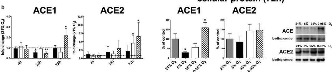 Detection of ACE-2 by Western Blot Expression of vasoactive proteins (mRNA and protein levels) in response to different oxygen conditions (mRNA: fold change relative to control condition: 21% O2; protein: % of control condition: 21% O2) as determined by qRT‐PCR using actb as house‐keeping gene and the delta delta Ct method and western blotting from cell lysates. (a) NOS3 mRNA expression, protein expression at 72 hr and Griess reaction (analyzed levels of NO2− and NO3− in the supernatants resulting from NOS activity). (b) ACE1, ACE2 mRNA expression and ACE1, ACE2 intracellular protein expression at 72 hr. (c) ACE1 and ACE2 protein levels in the cell culture supernatant as determined by Western blotting and mRNA expression of sheddases ADAM10 and ADAM17. p‐values result from statistical testing with Student's t‐test (mRNA), one‐way ANOVA (protein) and two‐way ANOVA (Griess) with Tukey's multiple comparison test. *p < .05; **p < .01; ***p < .001, ****p < .0001 Image collected and cropped by CiteAb from the following open publication (https://pubmed.ncbi.nlm.nih.gov/33565273), licensed under a CC-BY license. Not internally tested by R&D Systems.