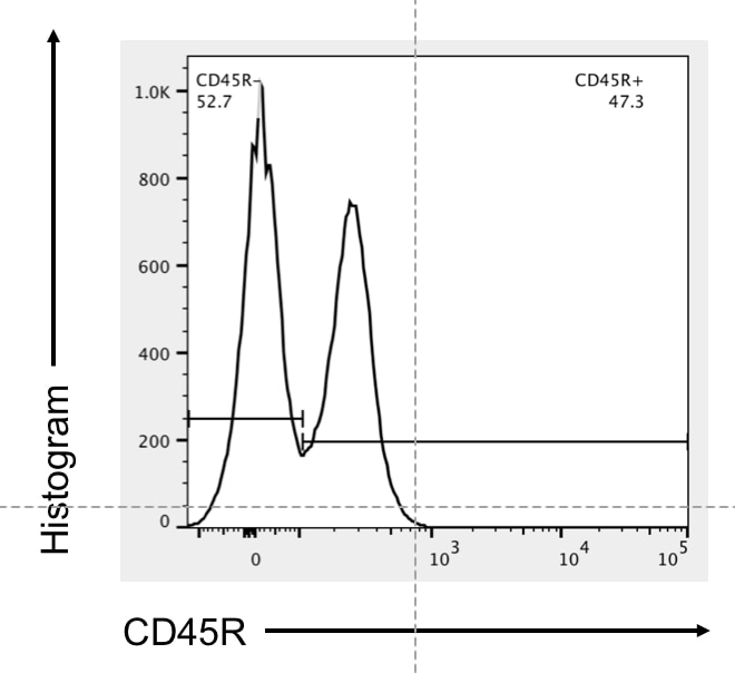 The single cell suspension was isolated from a spleen of an IL1-R KO (knockout) mouse and stained with the FITC-Conjugated CD45R antibody (1:100) for 30 minutes. Cells were analyzed by flow cytometer.