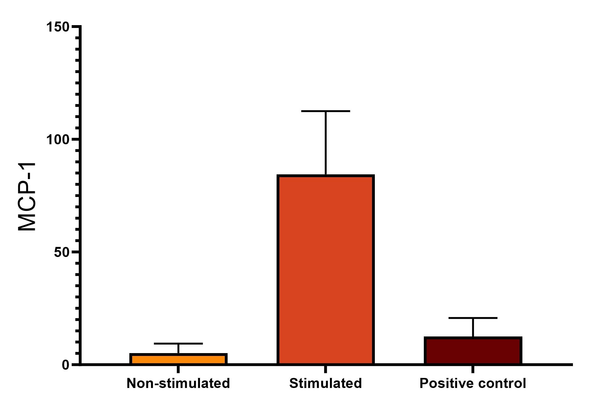 CCL2/JE/MCP-1, is a chemokine that binds the receptor CCR2 and induces the chemoattraction of mononuclear cells. It induces the activation of monocytes, NK cells, lymphocytes, and basophils. Additionally, CCL2 promotes Th2 polarization in CD4+ T cells, and CCL2-mediated recruitment of monocytes to sites of inflammation contributes to disease severity in atherosclerosis, multiple sclerosis, and allergic asthma. Endogenous proteolytic trimming of CCL2 at the N-terminus, including the N-terminal pyrrolidone carboxylic acid-modified glutamine, downregulates activity but not receptor binding.