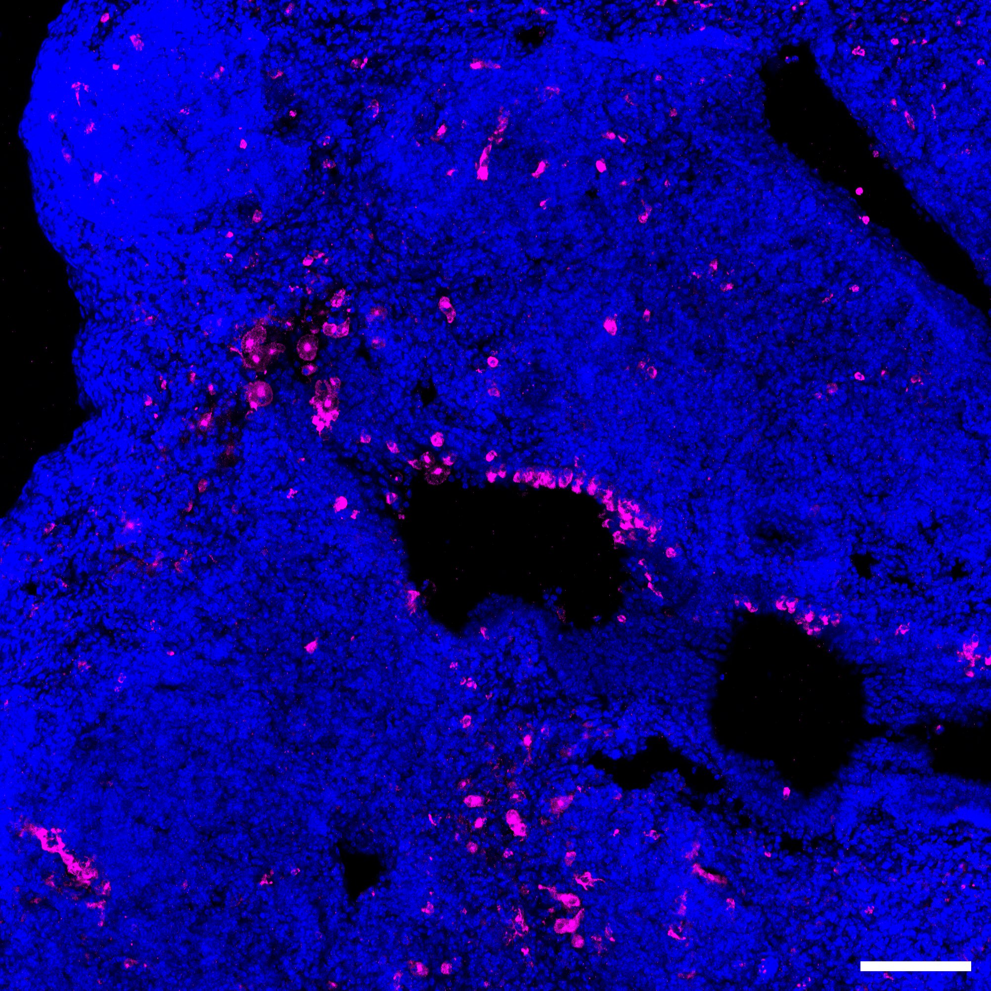 Influenza-treated mouse lung sections were fixed with 4% PFA and stained with anti-CCL9 primary antibody for overnight at 4 degrees Celsius and with Donkey anti-goat Alexa fluor 594 secondary antibody for 1 hr at room temperature.