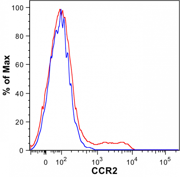 CCR2, also known as CD192, is a 38 kDa 7TM chemokine receptor that preferentially binds CCL2, CCL7, and CCL13. CCR2 is expressed by multiple hematopoietic cells, endothelial cells, fibroblasts, neurons, and smooth muscle cells. It functions as an HIV fusion co-factor and facilitates T cell recruitment during inflammation. Two alternate splice forms (CCR2A and CCR2B) differ only by the addition of 14 amino acids to the intracellular carboxyl terminal. Mouse CCR2 shares 67% and 95% aa sequence identity with human and rat CCR2, respectively.