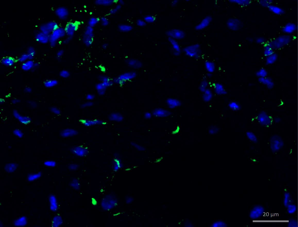 CD3 in Mouse Brain. CD3 was detected in perfusion fixed HSV-1 infected frozen sections of mouse brain (perivascular cuffing) using 10 µg/mL Rat Anti-Mouse CD3 Monoclonal Antibody (Catalog # MAB4841) overnight at 4 °C. Tissue was stained using the NorthernLights™ 493-conjugated Anti-Rat IgG Secondary Antibody (green; NL015) and counterstained with DAPI (blue). View our protocol for Fluorescent IHC Staining of Frozen Tissue Sections.