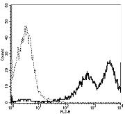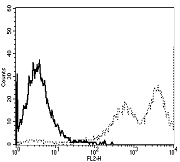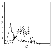 Figure 1:Lineage positive bone marrow cells from C57/Bl6 mice were depleted using monoclonal anti-mouse CD3, CD4, CD5, CD8 alpha, CD11b/MAC-1 alpha, B220, Gr-1 (Ly-6G) and TER-119 erythroid antigen antibodies and stained with goat anti-rat IgG PE-conjugated. Flow cytometric analysis was performed A) Before (dotted histogram) and after (solid histogram) the depletion antibody cocktail was added; B) Before (dotted histogram) and after (solid histogram) magnetic depletion using Dynabeads; and C) Expression of CD117 (SCF R/c-kit) (R&D Systems, Catalog # MAB1356; dotted histogram) in bone marrow-progenitor cells after enrichment using the mouse lineage panel and bead depletion.