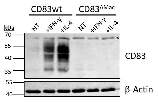 Bone marrow-derived macrophages from wt or conditional KO mice were stimulated either with IFN-y or IL-4 for 16 h. Whole cell lysates were prepared and 50 µg of protein was used for SDS-PAGE (16%) and western blotting (primary anti-CD83 1:500; secondary anti-goat-HRP 1:7500).