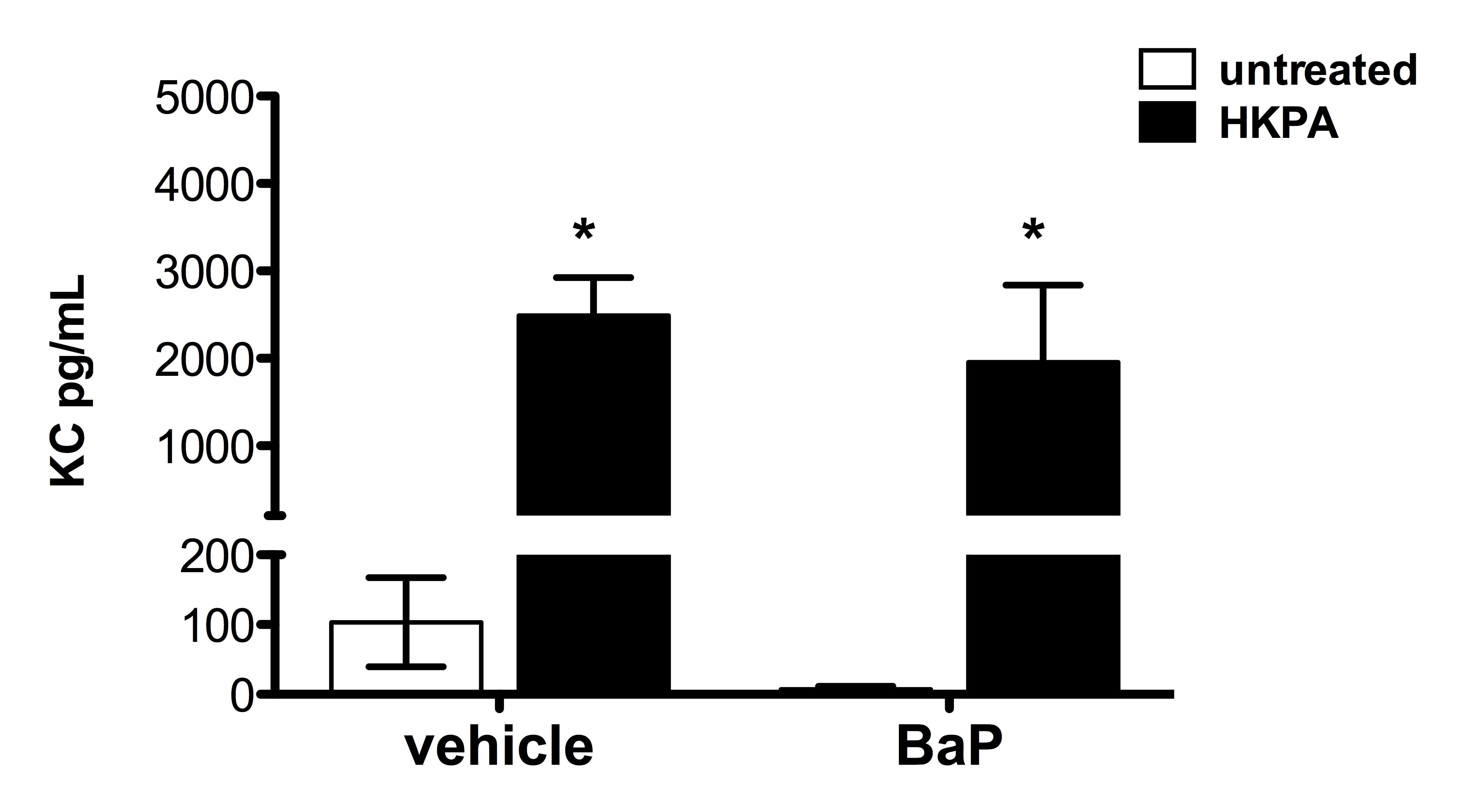 Murine bone marrow derived dendritic cells were propagated in bento(a)pyrene and exposed to heat killed pseudomonas aeruginosa (HKPA) for 24 hours. Levels of KC were assessed in the tissue cultures supernatants by ELISA. n=5, triplicate wells. * p < 0.05