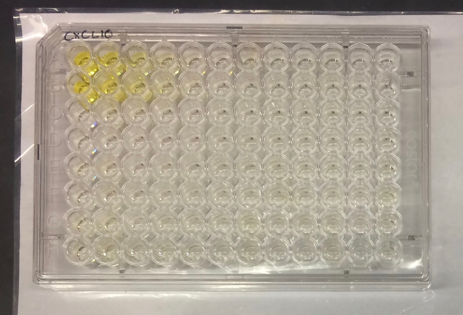 50ul of murine IL-10 Capture antibody (2ug/mL) was coated per well of a 96 well plate at 4 degrees overnight. Purified mIP-10 standard was diluted (7 fold) and assayed to ensure the quality of the ELISA. Mouse IP-10 Detector antibody was added (2h @ RT) followed by a 20 min incubation with Streptavidin-HRP. Substrate solution was added to measure mIP-10 concentration according to the manufactures protocol. The standard curve looked great as can be seen by calculation of the R- squared value. Highly recommend doing ELISA's using kits from R&D.