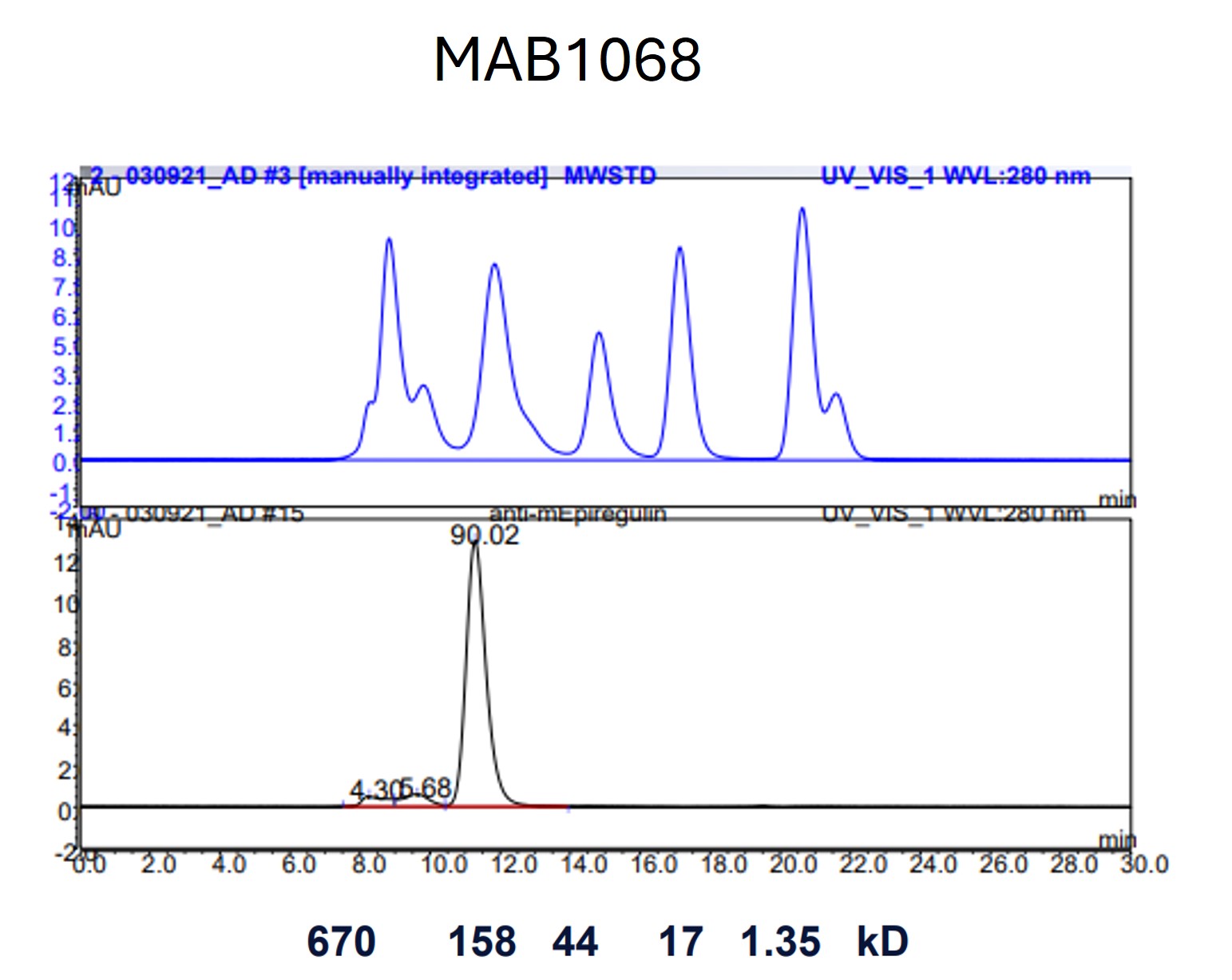 Epiregulin is a member of the EGF family of growth factors which includes, among others, epidermal growth factor (EGF), transforming growth factor (TGF)-alpha, amphiregulin (ARG), HB (heparin-binding)-EGF, betacellulin, and the various heregulins. They are all synthesized as transmembrane precursors and converted to soluble forms by proteolytic cleavage. Epiregulin was originally purified from the mouse fibroblast-derived tumor cell line NIH3T3/T7 (1). The mouse Epiregulin cDNA encodes for a 162 amino acid (aa) transmembrane precursor, with the mature soluble form comprising aa 56‑101 (2). The mode of action of Epiregulin is similar to other EGF family members in that it binds to and activates the tyrosine-kinase, ErbB-family receptors (ErbB1 through B4) (3). Although it stimulates phosphorylation of all four receptors, it appears to interact primarily with ErbB1 and ErbB4. Epiregulin has the broadest specificity of the EGF-like ligands but seems to preferentially activate heterodimeric receptor complexes (4). Epiregulin exhibits a variety of biological effects. It was originally shown to both inhibit growth of several epithelial tumor cells and stimulate growth of fibroblasts and other types of cells (1). Epiregulin expression is upregulated in a number of carcinoma cell lines. It has also been shown to be an autocrine growth factor in human epidermal keratinocytes (5). Epiregulin has also been shown to play a role in the early steps of pregnancy, regulating attachment of the blastocyst to the uterine epithelium during the implantation process (6).