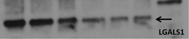 This antibody is very sensitive to detect galectin-1, last lane is marker, last but one is purified galectin, and the rest lanes are cell lysates from differnet cancer cell lines, so it shows that galectin-1 is actually modified.