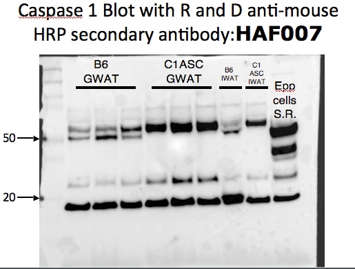 Detection of Mouse IgG by Western Blot Quantitative and qualitative analysis of protein synthesis in wild-type and Mstn−/− Tibialis anterior and gastrocnemius muscle using SUnSET.(A-B) Slot-blot western analysis for quantification of protein synthesis in the gastrocnemius and TA muscle. (C) Western blot showing total protein distribution and puromycin labelled polypeptides from wild-type and Mstn−/− TA muscle. Note that some bands remain of similar intensity whereas others decrease. (D) Altered profile of high levels of protein synthesis in IIB fibres of Mstn−/− TA muscle. (E) Immunochistochemistry for the expression of MHC IIB and high levels of protein synthesis determined by puromycin incorporation. (Scale bar = 100μm). (Two-way ANOVA; *p<0.05) Image collected and cropped by CiteAb from the following publication (https://pubmed.ncbi.nlm.nih.gov/25807490), licensed under a CC-BY license. Not internally tested by R&D Systems.