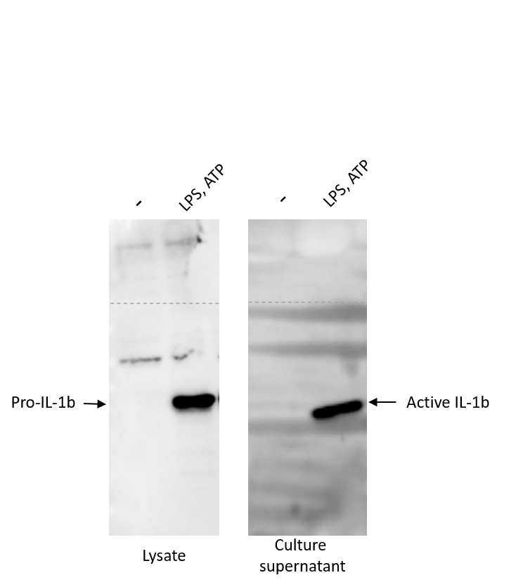 Detection of Mouse IL-1 beta/IL-1F2 by Western Blot ATP and nigericin can augment proteasomal-mediated IL-1 beta degradation.a BMDMs were primed with Lipopolysaccharide (LPS, 50 ng/ml) for 3 h and stimulated with ATP (5 mM) and Nigericin (10 μM) for up to 2 h. Total cell lysates were analyzed by immunoblot. One of three experiments. b, cCaspase-1−/− BMDMs were primed with LPS (50 ng/ml) for 3 h, and in the last 30 min of priming treated with MG132 (20 μM), as indicated. Cells were treated with b ATP (5 mM) and c Nigericin (10 μM) for up to 90 min. Immunoblots were performed on total cell lysates to detect the specified proteins. One of three experiments. d WT, Nlrp3−/−, Asc−/− and Caspase-1−/− BMDMs were primed with LPS (50 ng/ml) for 3 h and stimulated with ATP for 20 min. Ubiquitylated (Ub.) proteins were purified from cell lysates by Tandem Ubiquitin Binding Entities (TUBEs). Immunoblots were performed on cell lysates and TUBE isolated ubiquitylated proteins for the indicated proteins. One of two experiments. Image collected and cropped by CiteAb from the following open publication (https://pubmed.ncbi.nlm.nih.gov/33976225), licensed under a CC-BY license. Not internally tested by R&D Systems.