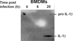 Detection of Mouse IL-1 beta/IL-1F2 by Western Blot P. gingivalis and its OMVs differentially induce inflammasome signaling and pyroptosis in murine macrophages. BMM were infected as before (2 h at MOI of 25:1, see Materials and Methods) with viable P. gingivalis (Pg), heat-killed-Pg (HK-Pg), OMVs, or heat-inactivated-OMVs (HI-OMVs) and (A) the activation of inflammasome components in the lysates [or supernatants (sup) where indicated] measured after 24 h by Western blot; beta -actin serves as a loading control throughout. Western blot data are representative of at least three independent experiments. (B) Production of IL-1 beta and IL-18 (by ELISA) from BMM was measured in the supernatant at 24 h. Data are mean ± SD from four independent experiments. Cell viability was determined by measuring extracellular LDH release and by 7-AAD exclusion (by flow-cytometry) at 24 h. 7-AAD is a membrane impermeant dye that is excluded from viable cells. The percent of 7-AAD positive (±SD) cells from three independent experiments was calculated relative to the untreated control. BMM treated with H2O2 (1 mM for 60 min) were included as positive control for 7-AAD. A representative histogram is shown. Cells were also treated where indicated with OMVs in the presence of KYT-1 and KYT-36 (10 μM of each). *p < 0.05. Image collected and cropped by CiteAb from the following publication (https://pubmed.ncbi.nlm.nih.gov/28824884), licensed under a CC-BY license. Not internally tested by R&D Systems.