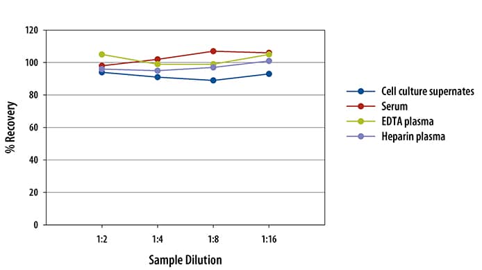 The recovery of mouse IL-20 spiked to three levels throughout the range of the assay in various matrices was evaluated.