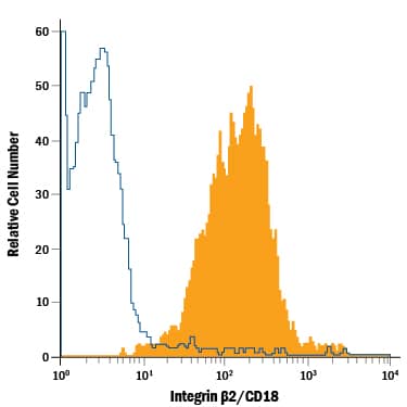 Detection of Integrin beta 2/CD18 in Mouse Splenocytes by Flow Cytometry. Mouse splenocytes were stained with Goat Anti-Mouse Integrin beta 2/CD18 PE-conjugated Antigen Affinity-purified Polyclonal Antibody (Catalog # FAB2618P, filled histogram) or isotype control antibody (Catalog # IC108P, open histogram). View our protocol for Staining Membrane-associated Proteins.