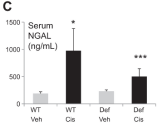 Wild type (WT) or IL33-/- (Def) mice were given either vehicle (Veh) or cisplatin (Cis) to induce kidney injury. Serum NGAL was measured as a marker of kidney injury.