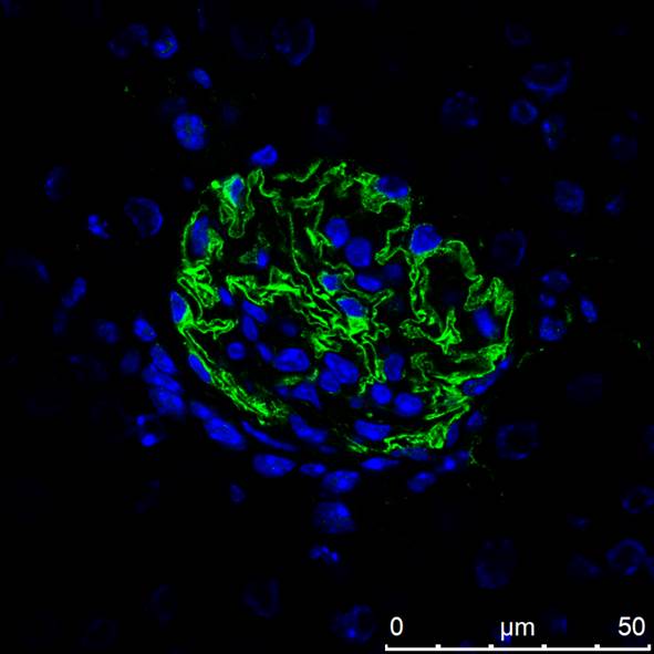 Nephrin in Mouse Kidney. Nephrin was detected in perfusion fixed frozen sections of mouse kidney using Goat Anti-Mouse Nephrin Antigen Affinity-purified Polyclonal Antibody (Catalog # AF3159) at 10 µg/mL overnight at 4 °C. Tissue was stained using the NorthernLights™ 557-conjugated Anti-Goat IgG Secondary Antibody (yellow; Catalog # NL001) and counterstained with DAPI (blue). View our protocol for Fluorescent IHC Staining of Frozen Tissue Sections.