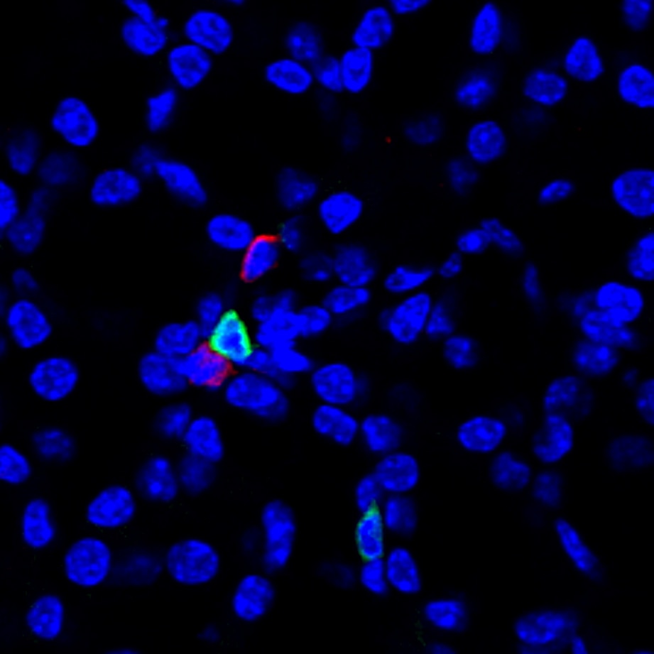 PLP-fixed salivary gland cryosections were stained with anti NKp46/NCR1 for 4h at room temperature. After washing, the samples were stained with Donkey anti-goat alexa546 2ndary antibody for 1h at room temperature. NKp46 in red, CD3 in green & Hoechst in blue.
