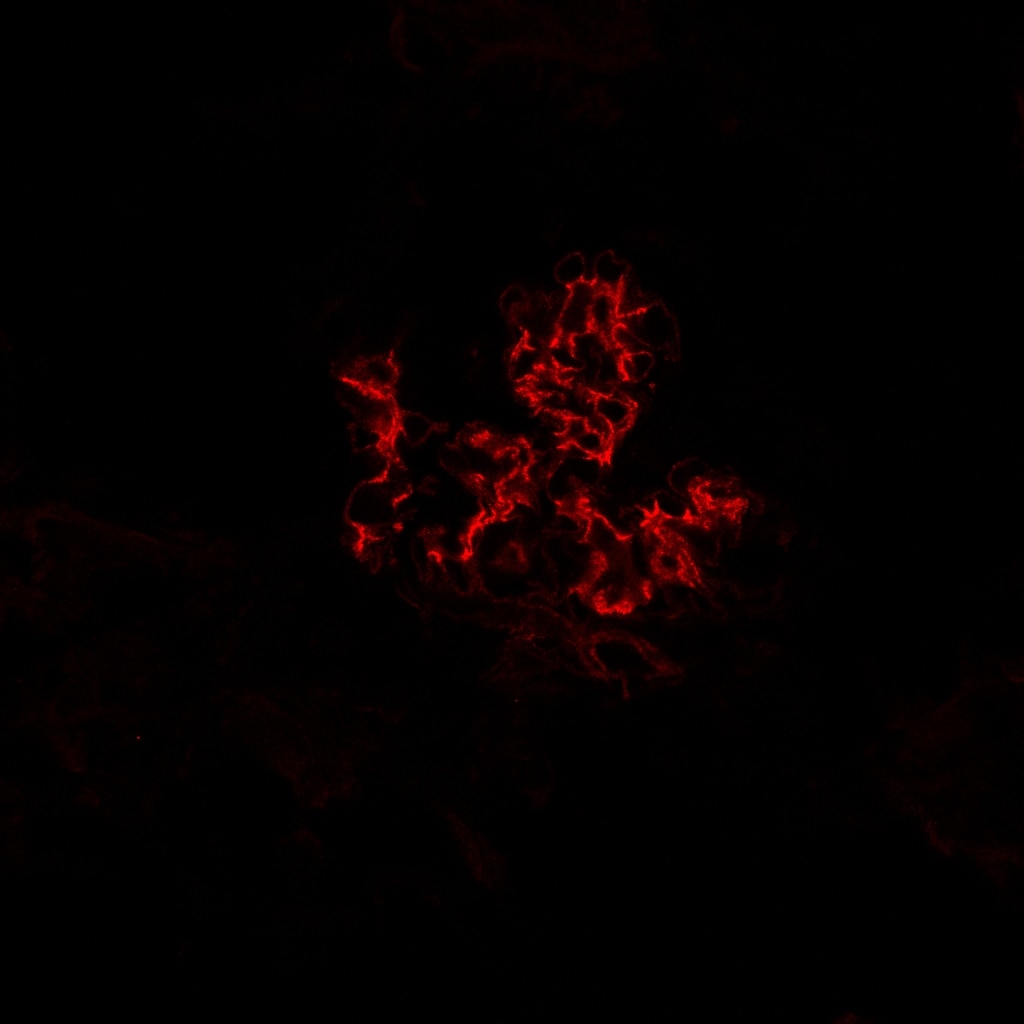 Detection of Canine Integrin alpha 8 by Immunocytochemistry/Immunofluorescence Integrin alpha 8 co-localizes with laminin 211 in the GBM of AS but not WT dogs.A-C: Dual immunofluorescence immunostaining of kidney from a WT dog; 63x 1.4 n.a. oil. The GBM was localized with anti-collagen alpha 5 ( alpha 5(IV)) and the mesangium was localized with anti-integrin alpha 8 (INT alpha 8). D-I: Dual immunofluorescence immunostaining of kidney tissue from an AS dog at milestone 2. Laminin 211, produced by mesangial cells, was labeled with anti-laminin alpha 2 (LAMA2) and mesangial cells were localized with anti-integrin alpha 8 (INT alpha 8), demonstrating co-localization of laminin 211 with mesangial cell extension in capillary loops. Images D-F were taken with 40x1.3 n.a. oil; images G-I were taken with 63x1.4 n.a. oil with 2X zoom. Image collected and cropped by CiteAb from the following publication (https://dx.plos.org/10.1371/journal.pone.0168343), licensed under a CC-BY license. Not internally tested by R&D Systems.