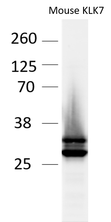 KLK7 (Kallikrein 7; also Serine protease 6, Thymopsin and Stratum corneum chymotryptic enzyme/SCCE) is a 27 kDa (predicted), secreted glycoprotein member of the kallikrein subfamily, peptidase S1 family of enzymes. It is an IL-4 and IL-13-inducible chymotrypsin-like serine protease that has restricted expression, being associated with stratum spinosum and granulosum keratinocytes, distal and proximal convoluted tubule epithelium, limited pancreatic acinar cells. In contrast, KLK7 is widely expressed by a variety of carcinoma cell types. KLK7 preferentially cleaves peptide bonds that contain an aromatic (Tyr or Phe) residue in the P1 (or postcleavage C-terminal amino acid) position. Molecules known to serve as substrates for KLK7 include chemerin, fibronectin, E-cadherin, LL37, procaspase-14, MMP-9 and desmoglein. The nature of the KLK7 substrates indicates that it plays a key role in intercellular adhesion dissolution with subsequent cell migration. Mouse KLK7 is synthesized as a 249 amino acid (aa) precursor. It contains a 21 aa signal sequence, a four aa prosegment, and a 224 aa mature region (aa 26-249). The mature molecule contains one large protease domain (aa 26-246) and a variable, three aa C-terminus that possesses either a VSW or ASR motif. Over aa 22-249, mouse KLK7 shares 75% and 85% aa sequence identity with human and hamster KLK7, respectively.