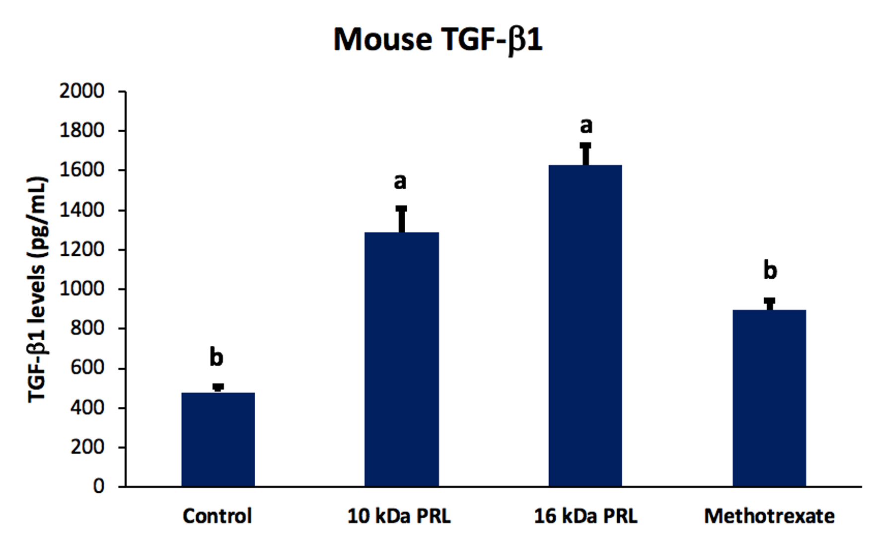 This kit was used to assess TGF-b1 from mouse hepatic tissue after prolactin treatments. Instructions were very easy to follow and the system is accurate and reliable. We will definitely acquire more of these kits for further research. In the picture, the effect of prolactin treatments on the expression of this cytokine were evaluated in mouse seric samples, previously treated with: control (no treatment), 10 kDa prolactin, 16 kDa prolactin, and a prolactin receptor inhibitor (methotrexate)