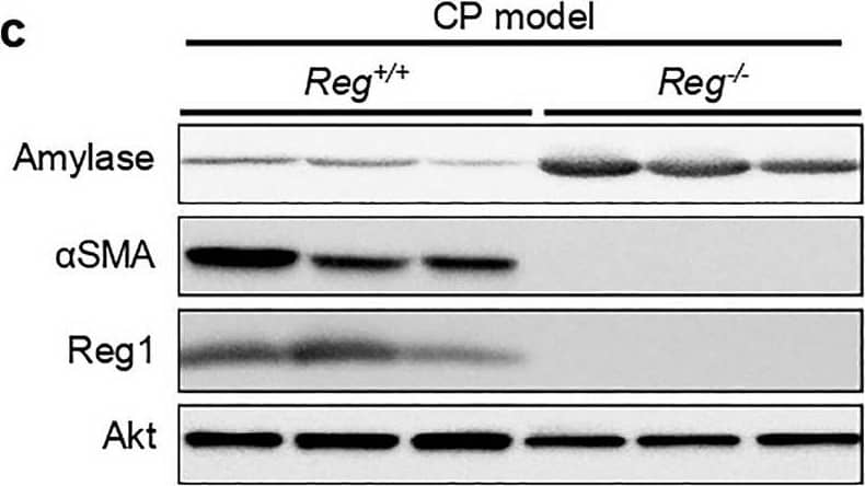 Detection of Mouse Reg1 by Western Blot Reg deficiency led to the remission of chronic pancreatitis. (a) Representative pancreatic tissue section from mice of the indicated genotype at 8 weeks was stained with H&E or Azan (for collagen, dark blue) and Immunofluorescence staining of alpha-smooth muscle actin ( alpha SMA, an activated PSCs marker, red) (n = 5 mice). Scale bars: H&E, 50 μm; Azan, 100 μm (b) Pancreatic mRNA expression of proinflammatory cytokines interleukin 6(Il6), tumor necrosis factor a (Tnfa) and Il1b of indicated genotypes were assessed by qRT-PCR. The expression amounts of each gene were calculated relative to those of ribosomal protein S3 (Rps3) with the fold change to CP model_Reg+/+ mice. Mean ± SEM (n = 5 mice). Statistical analysis was performed by two-tailed unpaired Student t-test between two groups. *P < 0.05 (c) Cropped images of western blot gels of Amylase, alpha SMA and Reg1 of the pancreas of indicated genotypes at 8 weeks and Akt was used as the loading control (n = 5 mice). The samples derived from the same experiment and gels were processed in parallel. Images of the entire gels and respective densitometric quantification analysis of the relative intensity of protein are presented in Supplementary Fig. 4,8. Image collected and cropped by CiteAb from the following open publication (https://pubmed.ncbi.nlm.nih.gov/37500741), licensed under a CC-BY license. Not internally tested by R&D Systems.