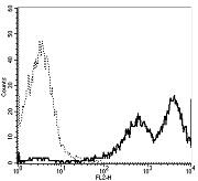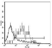 Figure 1:Lineage positive bone marrow cells from C57/Bl6 mice were depleted using monoclonal anti-mouse CD3, CD4, CD5, CD8 alpha, CD11b/MAC-1 alpha, B220, Gr-1 (Ly-6G) and TER-119 erythroid antigen antibodies and stained with goat anti-rat IgG PE-conjugated. Flow cytometric analysis was performed A) Before (dotted histogram) and after (solid histogram) the depletion antibody cocktail was added; B) Before (dotted histogram) and after (solid histogram) magnetic depletion using Dynabeads; and C) Expression of CD117 (SCF R/c-kit) (R&D Systems Catalog # MAB1356; dotted histogram) in bone marrow-progenitor cells after enrichment using the mouse lineage panel and bead depletion.