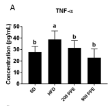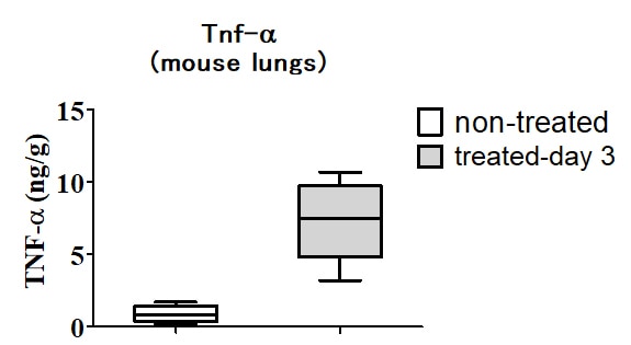 The evaluation was conducted in seric samples from adult C57BL/6J mice after 12-weeks treatment with a high-fat diet (60 % calories from fat). Results were accurate and showed a potent TNF-a levels in the serum samples.